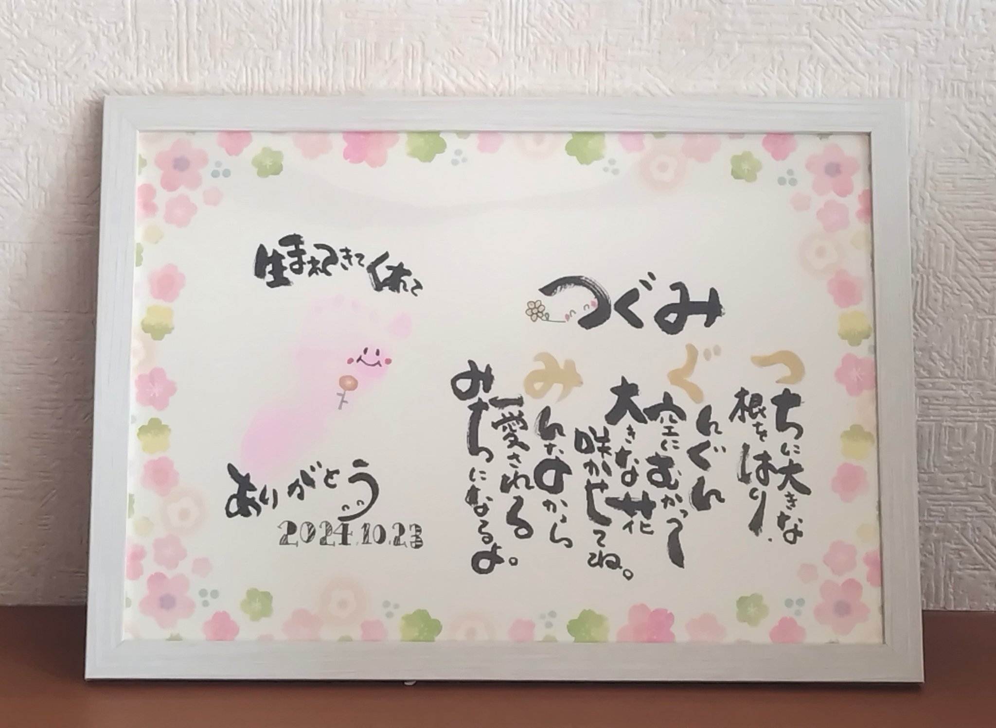 無料プレゼントの足形はがきを、赤ちゃんのお名前をいれた詩入りの筆文字アートにバージョンアップ(A4サイズ・額入り)2000円