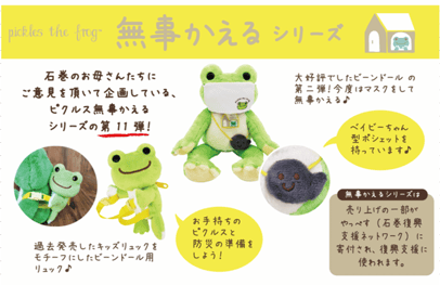 お知らせ · 2022/09/06 無事かえるビーンドール第2弾発売開始しました 大好評の無事かえるビーンドール 第2弾はマスクバージョンのピクルスです。 いっしょにお出かけしたくなりますね! ご購入は無事かえるウェブページからどうぞ ↓↓ 無事かえるシリーズウェブショップ tagPlaceholderカテゴリ: