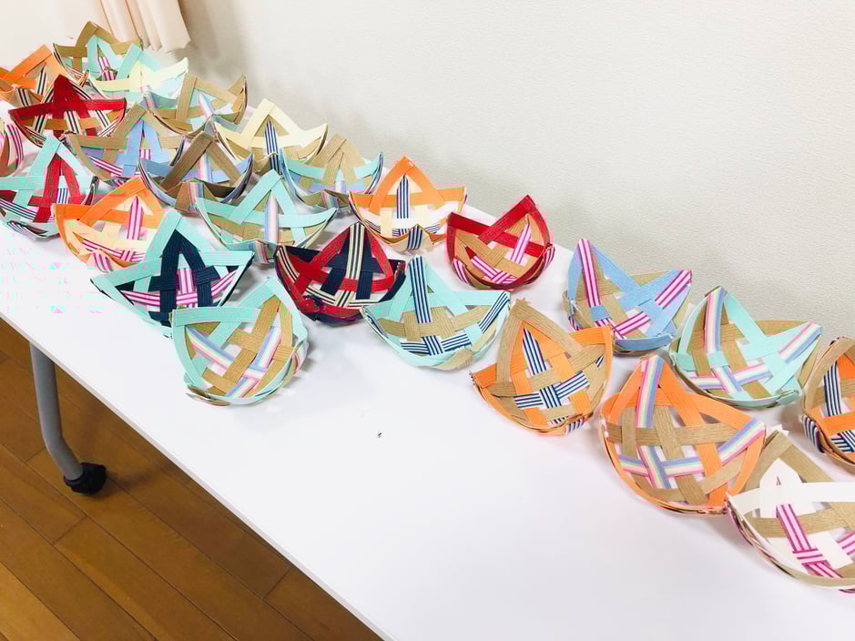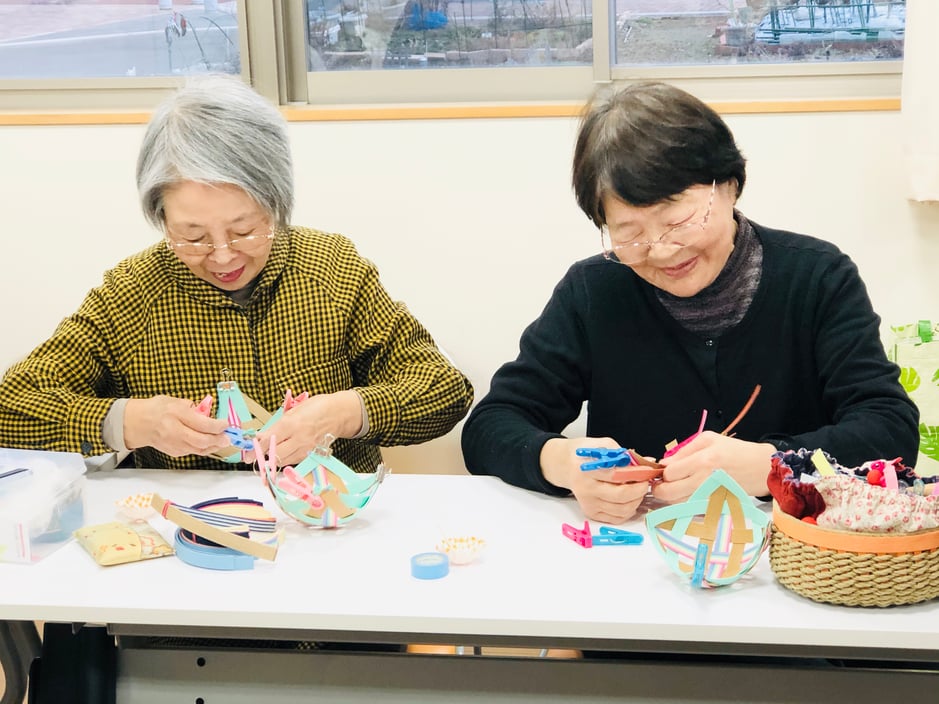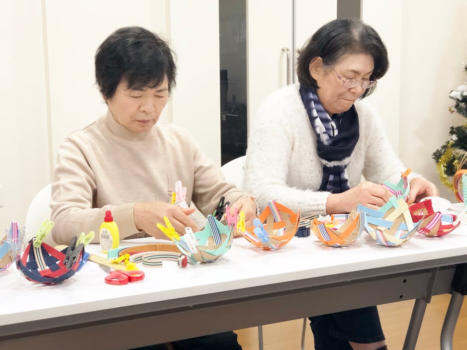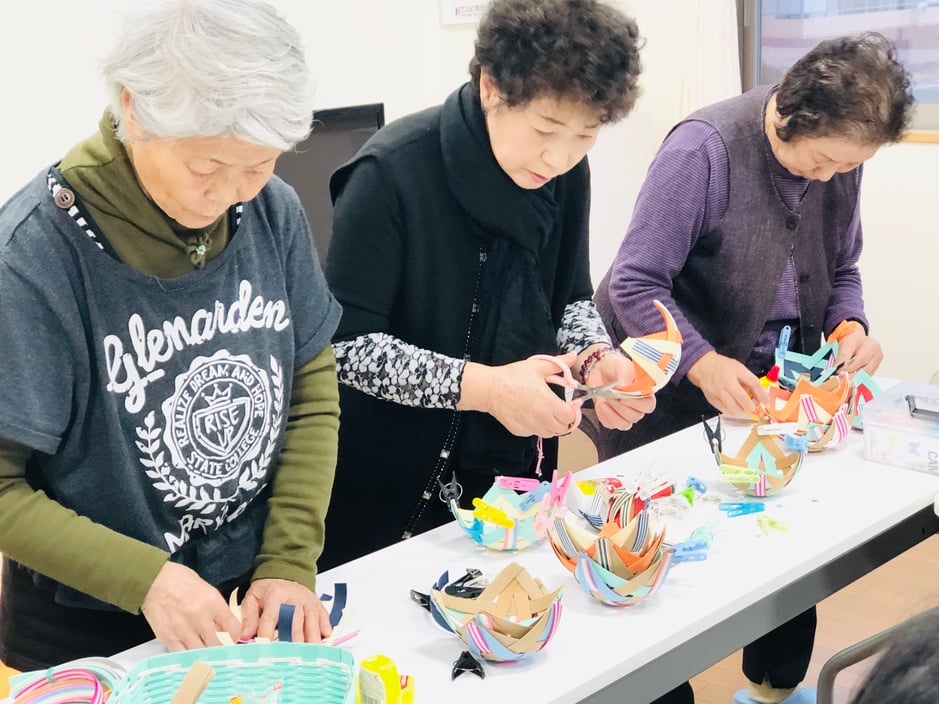 1月14日に交流会の歌の練習2回目と、当日の参加者さんのお菓子の入れ物を紙ひもを使って作成しました。