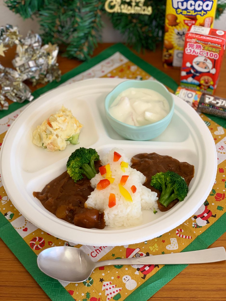 メニューはカレー ポテトサラダ フルーツたっぷりのヨーグルト和えです。