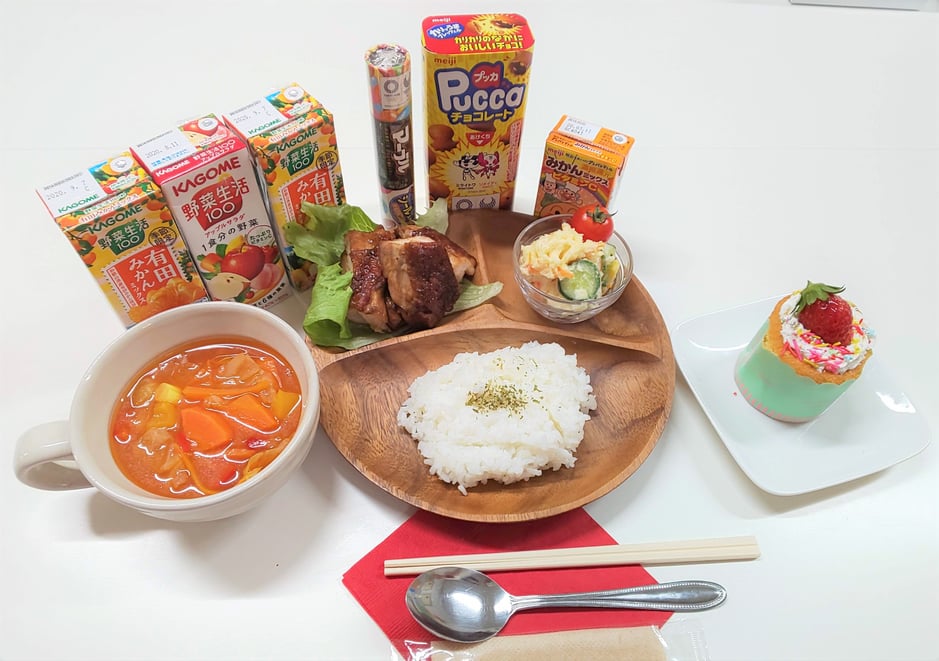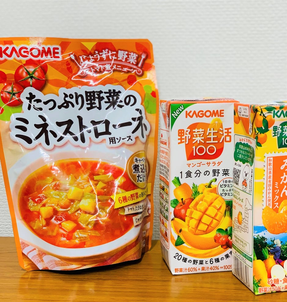 今回食事の時に提供した野菜ジュースや、ミネストローネの素はカゴメ株式会社さんから