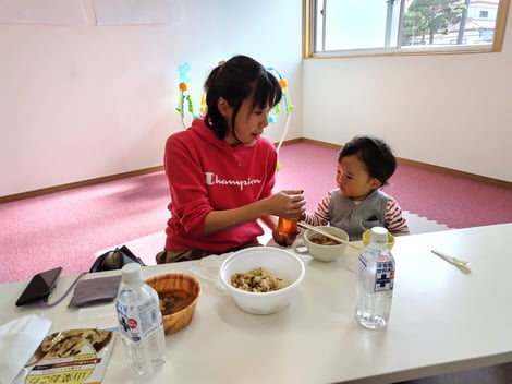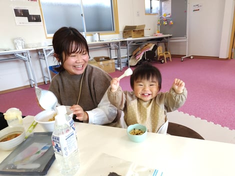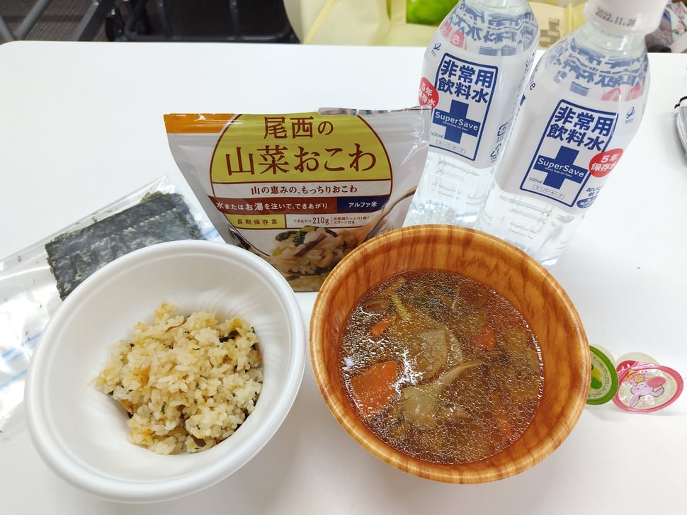 今日のメニューは、防災食のおこわとマタギ汁、子どもたちが食べやすいように海苔を添えました。