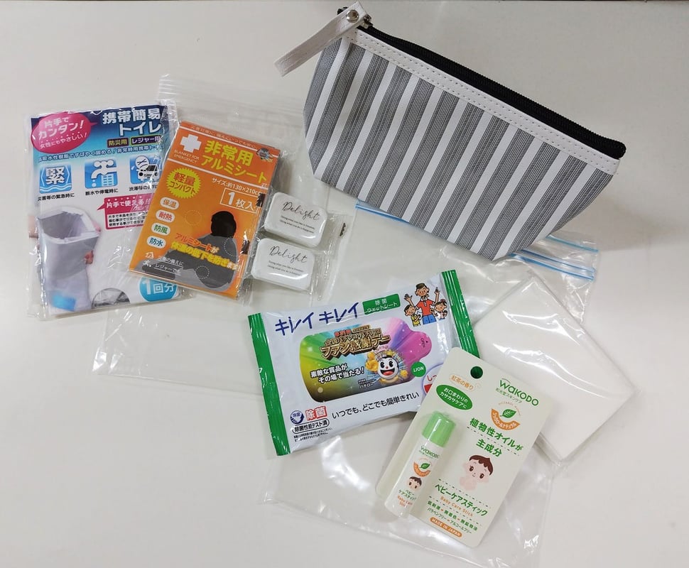 いざというときの携帯トイレ、水につけると大きく広がる使い捨てタオル、防寒のためのアルミシートは、
