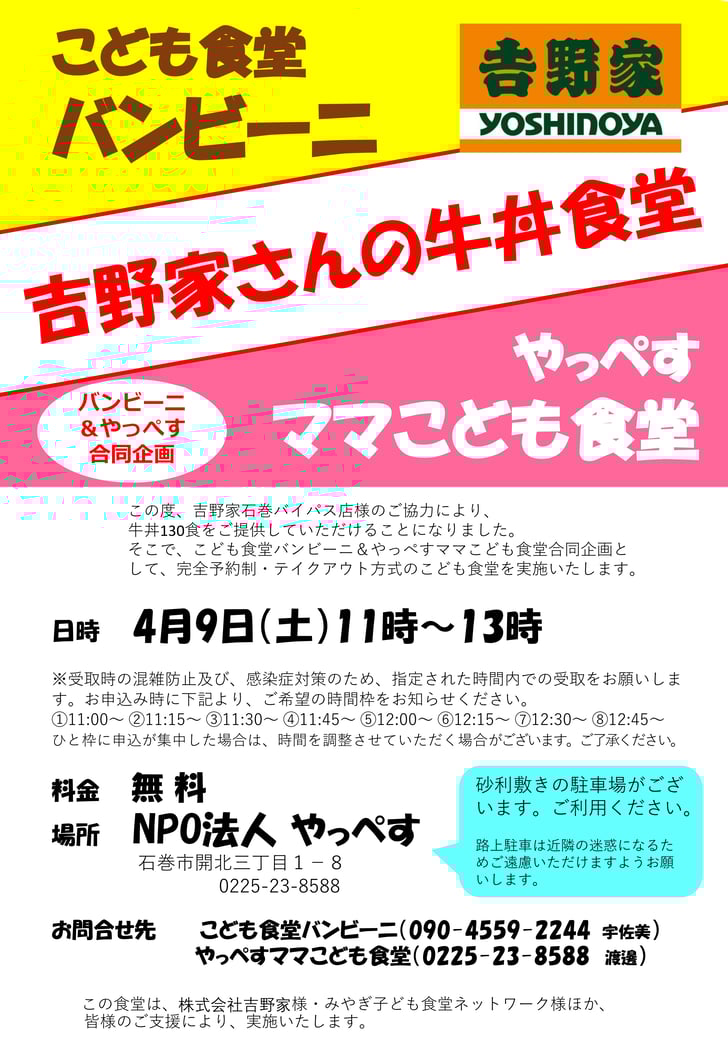 4月9日(土)に、「子ども食堂バンビーニ&やっぺすママ子ども食堂合同企画 吉野家さんの牛丼食堂」を実施いたしました。