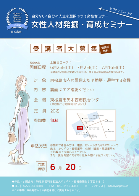 東松島市様からの委託事業として東松島ヴィーナス『通称:ひがまつヴィーナス』〜自分らしく自分の人生を選択できる〜女性人材発掘・育成セミナー3日目に予定していた講座は記録的な大雨の影響で7/16(土)から9/10(土)に延期となりました。