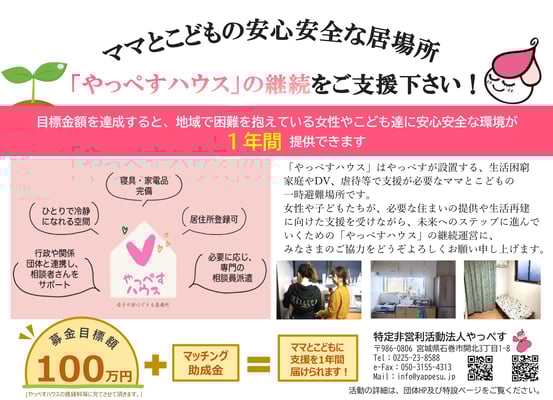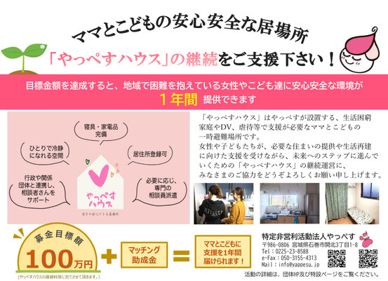 今回は、これまで以上にこの女性やこどもたちに寄り添った支援をしていくため、受け入れできる部屋数や相談員の拡充に