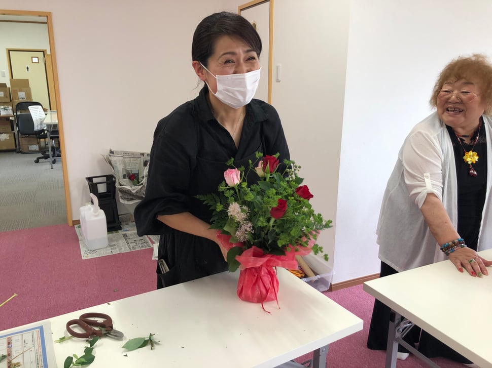 花うさぎの三浦先生から、花器のプレゼントもあり、花材を次々にさしてそれぞれ素敵に出来上がりました。