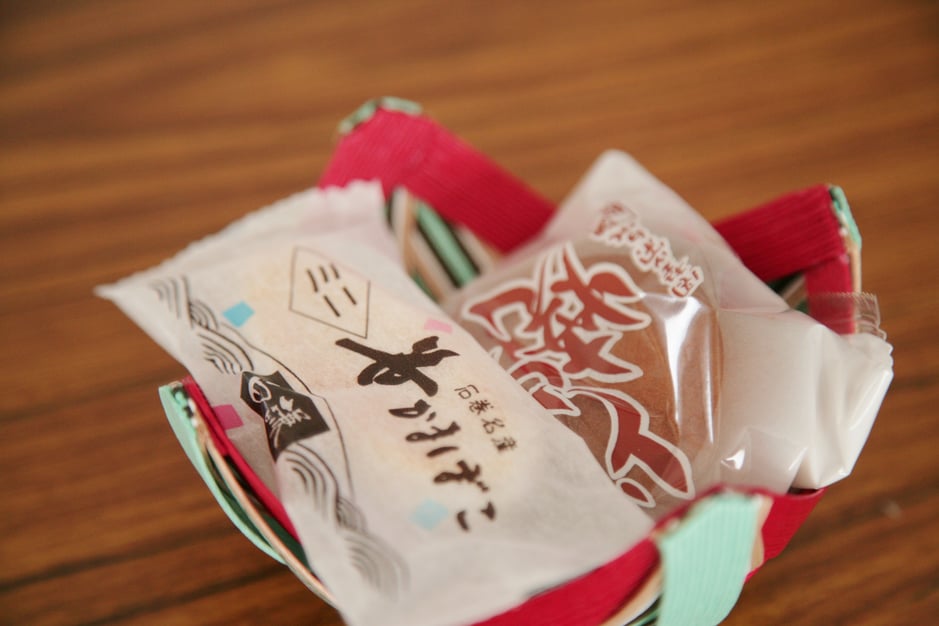 なないろの里のみなさんに喜んでもらえるようにと、手作りのカゴのお菓子入れに石巻の名物「岡埜栄泉のどら焼き」と、「白謙のミニささかま」を入れて参加者さんへプレゼントしました♪♪
